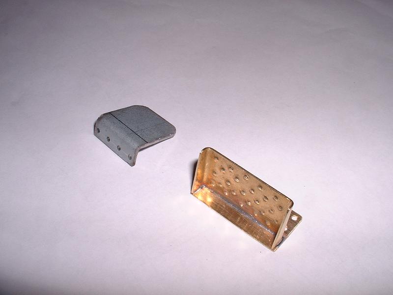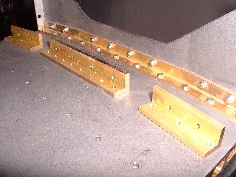 cab seats and reverser mounting, noting that there are more rivets on the driver's side than the fireman's. I shall probably cut the tops of the sides back to the correct position for the upper rain strips and make new fixed and sliding roof sections, with the joints hidden by the rain strips, and fit correct scale roof hatches on the sliding section. I'll use small-headed M3 bolts on the floor and bulkhead edge connections so that the cab could be dismantled if necessary, although it will normally be removed from the frames as a single unit. Apologies if this is getting a bit long-winded, but I like to get my thoughts down in writing before wielding the hacksaw!10/10/07 I've bought some 1/16" brass angle in 1/4" and 3/8" widths and started to assemble the cab. The photograph shows the rear guard secured with a continuous length of 3/8" angle and small-headed M3 bolts, with the three thicker angles as supplied in the foreground for comparison. The smaller continuous section looks much neater, and quite similar to the real thing as shown here. I had to notch the inner sides of the floor support brackets to accommodate the outermost bolts. I'll use 1/4" angle to fix the cab sides to the bulkhead, but I'll have to retain the thick section angles between the cab sides and floor because the reverser support is brazed to one of them.