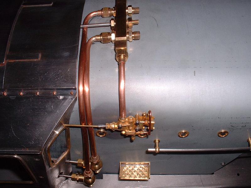 25/1/08 I've silver-soldered a pipe elbow to the carriage heating valve and fitted the outlet pipe. Harry L sent me this photo of the manifold of a superb 5 " Britannia that we saw at the Harrogate show two years ago. I believe that this is the correct pipe layout, so my plan now is to block off the front right manifold outlet using one of the two apparently superfluous blanking plugs provided, fit a thin (3/32") pipe for the pressure gauge from the front centre outlet, and fit a 3/16" pipe to the front left and run this down the front of the cab and use it with a suitable union to feed both the whistle and the steam brake. I'll then run the blower pipe from the left end outlet down the side of the firebox to a dummy duplex valve, then into the cab and fit the blower valve above the reverser gearbox. This picture shows this pipework on 70000 - I think the blower pipe runs from the top of the duplex valve into the driver's blower valve in the cab, and the outlet pipe from the blower valve runs forward from the cab under the duplex valve and into the trunking, along with the two ejector feeds from the duplex valve. I'm not sure what the other pipe coming down from the manifold is for - possibly sanders and/or drain cocks - but it has a tee running into the cab at the top which could perhaps be for the pressure gauge or the steam brake.
