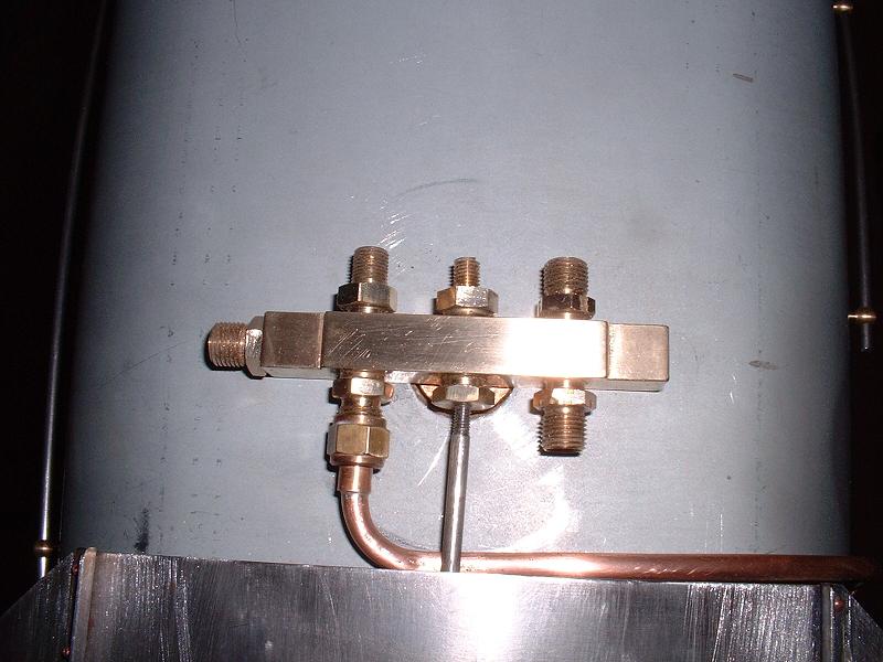 7/2/08 I've changed my mind yet again - I hope that nobody is copying my every move! I decided that I might as well use the 3/32" pipe running down from the T junction as the steam brake feed rather than a dummy, and revert to a blanking plug on the front right hand manifold outlet. Although I do have a photo showing a Britannia with a pipe running to the left from this outlet, it's of 70053 'Moray Firth' which would have had the BR1D high-sided tender, and I suspect that this feed may be for the steam-powered coal pusher fitted to that type of tender. I've had some trouble silver soldering the three pipes into a short length of 8mm brass rod to form the T junction, but after several abortive attempts I have now succeeded.