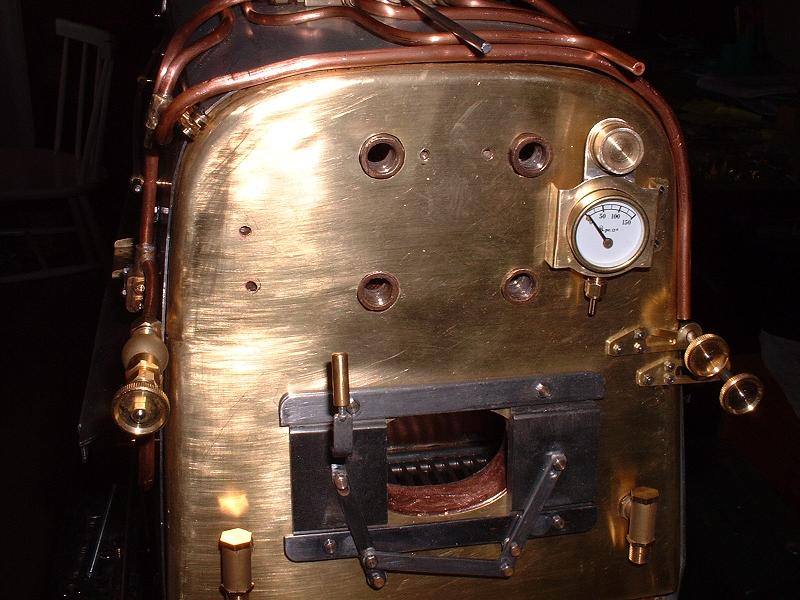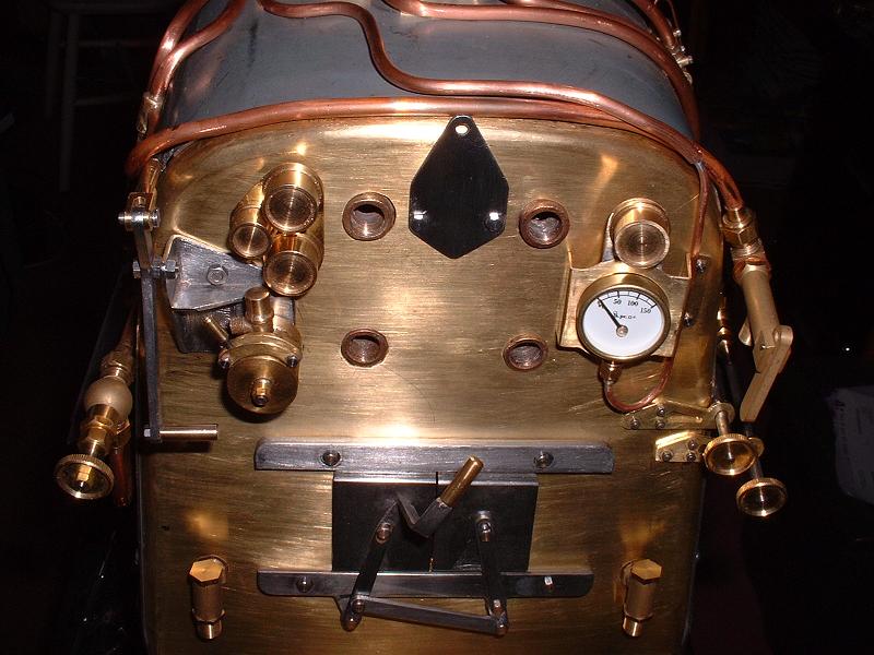 28/2/08 I've made the brass handle for the regulator and the new manifold shut-off bracket, and also a new bracket for the three left-hand dummy gauges. I've replaced the last photo to include these. I'll fit the large speedometer gauge to the left of the regulator lever, on a bracket attached to the cab roof. I've bolted the lower sides of the firebox cladding to the backhead cladding, using captive nuts soldered behind the backhead cladding. I'll buy some authentic Gresham and Craven style handwheels for all the cab valves. The dummy manifold valve spindle would be too close to the cab roof to fit a handwheel if I ran it over the pipes, so I'll cut it in half and fit the handwheel to a stub on the bracket. This completes the work on the backhead. We're away on holiday for the next week, and when I get back I'll chase Modelworks for the remaining missing parts - there's not much more that I can do without them.
