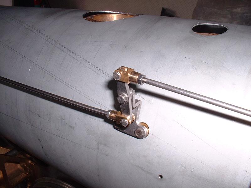 24/2/08 I've fitted the whistle valve and the pressure gauge pipe. I initially mounted the whistle valve immediately to the right of the pressure gauge bracket, but it looked rather obtrusive - I'm not sure why it needs to be so long - so I moved it to the side of the firebox where it will be out of the way. I'm next going to fabricate a new bracket for the regulator lever, more in keeping with the prototype. I've extended the clevis for the top of the regulator lever with a 13mm length of 3/16" brass rod drilled and tapped M3, so that I can move the regulator lever back a little and avoid the forks of the clevis catching on the cladding.