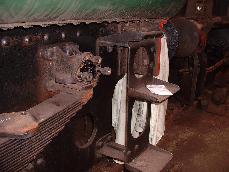 20/4/06 I removed the brass steps from the tops of the buffer stocks and replaced them with the castings that I bought from Doug Hewson (see kit 10, 1/4/06). I also modified the bottom brackets of the rear steps so that their flanges are on the top, bolted to the two top holes for the guard irons, as shown here.