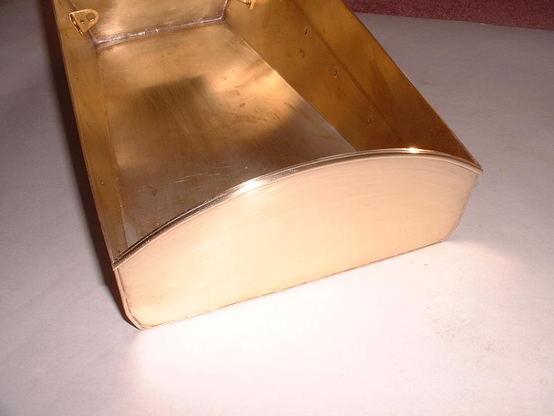 10/2/06 I started on the extra details for the front of the tender, making the coal chute from 22swg brass. I widened the sides of the coal chute opening slightly to 60mm, flush with the side walls of the removable section. The coal chute projects 27mm and the sides are 27mm high, with notches at the top to locate them under the front face. The base of the projecting part is horizontal, with a rounded strip of 1/4x1/16" brass soldered across the front, and the base slopes down inside the opening and is soldered to the underside of the side walls.