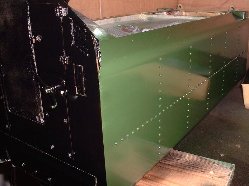 3/12/06 I've rubbed the tender down again and put another coat of green on. The finish is still not quite as good as I would like - the successive passes of the airbrush are not flowing together as uniformly as they should. I suspect that the cold temperature in my garage may be to blame. Also the removable top plate behind the bunker, which was the part mainly affected by 'orange peel' during the first painting session, is proving difficult to rectify - it's difficult to rub down the areas around the rivets satisfactorily. I think I may strip this piece back to bare metal and start again. Perhaps I'm being too fussy - in normal light viewed from a couple of feet away it all looks fine.