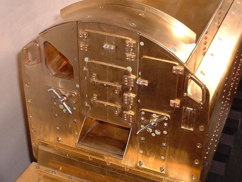 12/12/05 I dismantled the front locker again and filed and polished the parts, and bolted it together again properly. The large and small locker doors show only a rudimentary amount of detail and I intend to improve them by making better simulations of the hinges and of the locking plates for the rotating bars. This photograph shows the large locker doors on 70000. One oddity is that the hinges on the right hand door look much meatier than those on the left!