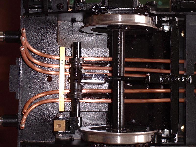 I bolted the three pipe connectors through the tender base - these connect to copper pipes running forward under the tender floor as follows: