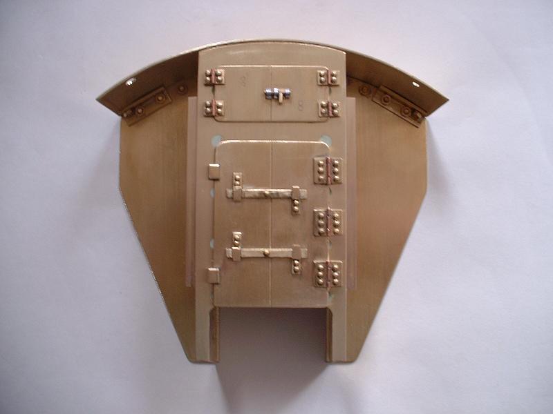 13/12/05 Richard P has solved the riddle of the locker door hinges - the doors must operate concertina-fashion with a hinge down the central joint, so the plates on the left are not hinges but locating lugs. I shall simulate the doors accordingly. I made the extra brackets to support the outer ends of the curved locker roof - I'm ashamed to say that I countersank one of the holes too deeply and the screw pulled through, so I've had to turn the roof round and drill new holes, leaving the old ones to be filled in later. I started on the large locker doors, engraving a deep line down the centre and modifying the left hand side to have two small lugs rather than three hinges. The rotating bars and locking plates need to be offset to the left - the pivot is on the left-hand door - so there are more holes to be filled in.