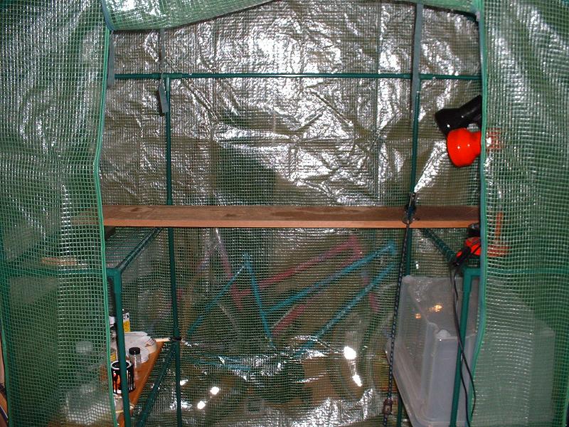 I've spent the past few days carefully rubbing down the tender and filling blemishes with knifing putty. It's all too easy to rub edges down to the bare brass, and I've had to touch these in with etch primer again and wait 24 hours, so it's a slow process. I decided that I need a better painting booth to avoid getting dust on the final coats, so today I bought a small plastic greenhouse (£39.99 from Argos) complete with side shelves and a zip-down front door. I've also bought a new disposable overall which I'll reserve for painting - my other one is covered in muck from working on 70013 at Loughborough. I'll spray the interior of the greenhouse with water to settle the dust before each session, and hopefully this will achieve the desired results. The greenhouse is a bit on the small side - I believe that Homebase do a larger one for about £50 - but I wanted to be able to get my car into the garage when I'm not actually painting. I'm sure that it would be easy to construct a similar booth from timber battens and polythene sheeting.