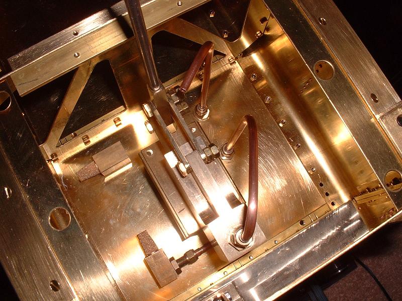 8/10/06 I've now fitted all the dummy studs and nuts to both filters, and made the second water valve. I noticed yesterday that Oliver Cromwell has a square head on the left hand valve and a hexagonal one on the right, but I don't intend to take realism that far - square heads seem to be the norm. I also started to fit the hinged flap at the bottom, using 1/16" brass rod to pin the hinges. I might buy an 8BA tap and die to cut a working screw thread for the latch.