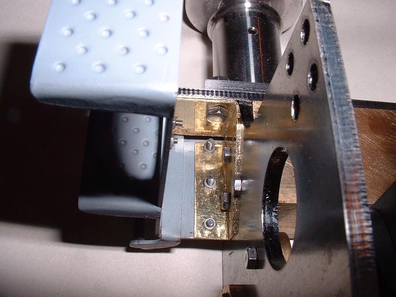 28/12/05 I made a new spindle for the water pickup unit handle to match the new handbrake spindle (see 26/12/05 above) and fixed it into a brass plate screwed to the back of the bulkhead, angled slightly upwards to match the handbrake spindle. I started to modify the fixing brackets for Doug Hewson's rear tender steps, which I think I can do satisfactorily without troubling Doug.