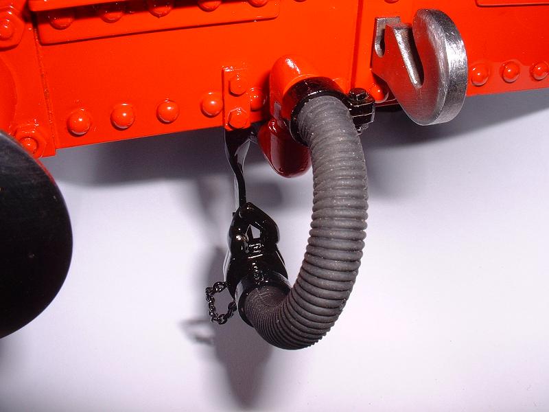 17/3/07 I've painted and fitted the tender vacuum pipe, as shown in the photograph. I've also modified the loco vacuum pipe connectors to have a spring clip and chain, but Modelworks have only supplied one rubber hose so far, so I can't fit this. The next job is to paint and fit the yellow axle box covers on the tender and pony.