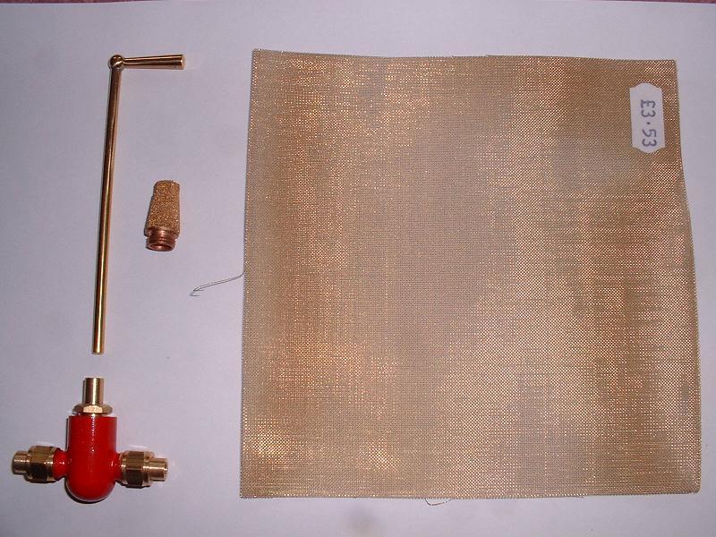 open or closed. The handles are not long enough to extend right up through the rear top plate, so I'll drive with the plate off to start with and decide whether to extend them later. I've been told that the two water filters supplied in kit 4 and pictured here are not very practical - they are made from sintered metal particles and designed as silencers for pneumatic fittings. They apparently clog easily, and are then difficult to clean. I've therefore bought a 6" square of brass gauze from Blackgates and will use this to make four new filters for the four delivery pipes.