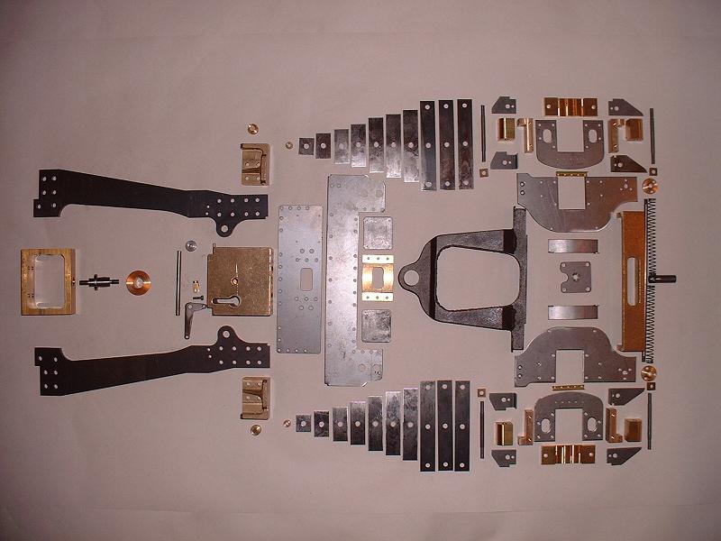 19/1/06 Kit 6 arrived at 8 o'clock this morning. It consists of the rear frame extensions, the drag frame and rear beam, and the pony truck assembly with its horn plates and springs. The pony truck pivots under the frames, with springs to control its sideways movement. This photograph shows the rear frame extensions on the left, the drag frame and rear beam in the centre, and the pony truck assembly on the right with the spring leaves above and below. All the parts seem present and correct as usual, and the kit should not take too much time to assemble. I'll bolt it together loosely first, and then dismantle it to clean the parts up properly.
