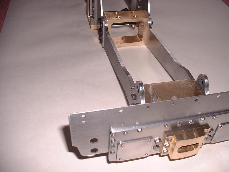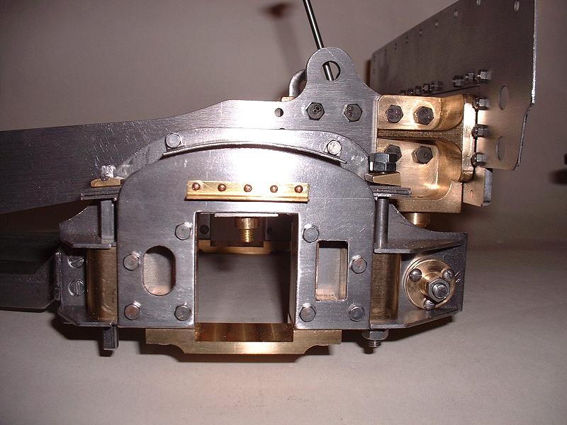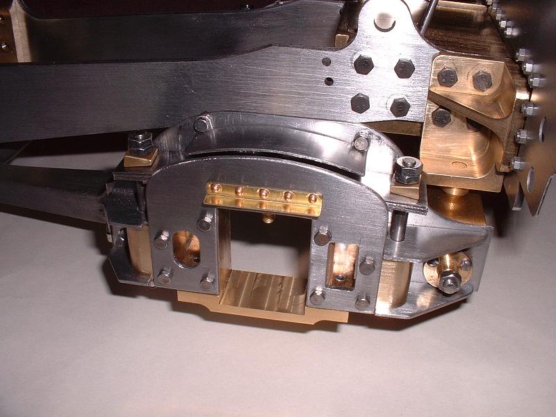 I rivetted the beam pads to the rear beam and bolted on the larger beam plate - I used small-headed 6BA bolts rather than the screws provided, and bolted the large plate to the front rather than the rear surface of the rear beam - this picture of Britannia shows both these detailed points. Update 17/9/07: I've had to move it back to the rear surface, to get the cab positioned correctly. I then bolted the rear beam and the coupling block to the rear of the drag frame, thus completing this fixed part of the rear end. I loosely assembled the pony truck, and will now dismantle it and file and polish the parts before final assembly.