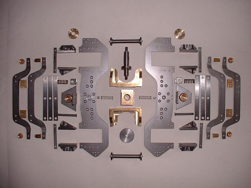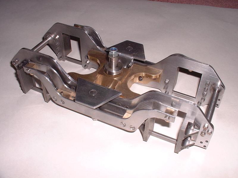4/2/06 I've filed, polished and assembled the frames, stretchers, pressure brackets and the mounting block with its springs and pivot pin. This all fitted together very nicely, with two minor exceptions - the springs can fall out of their sockets if the mounting block is pushed right over to one side, and there is about 3mm of vertical free play on the pivot pin, which is sufficient for the pressure pads to fall out if the locomotive is lifted with the bogie dangling below. I can fix both these problems easily enough, by fitting locating pins for the springs into the sides of the mounting block and by reducing the shoulder on the pivot pin, but I'll check with Modelworks on Monday before doing so.