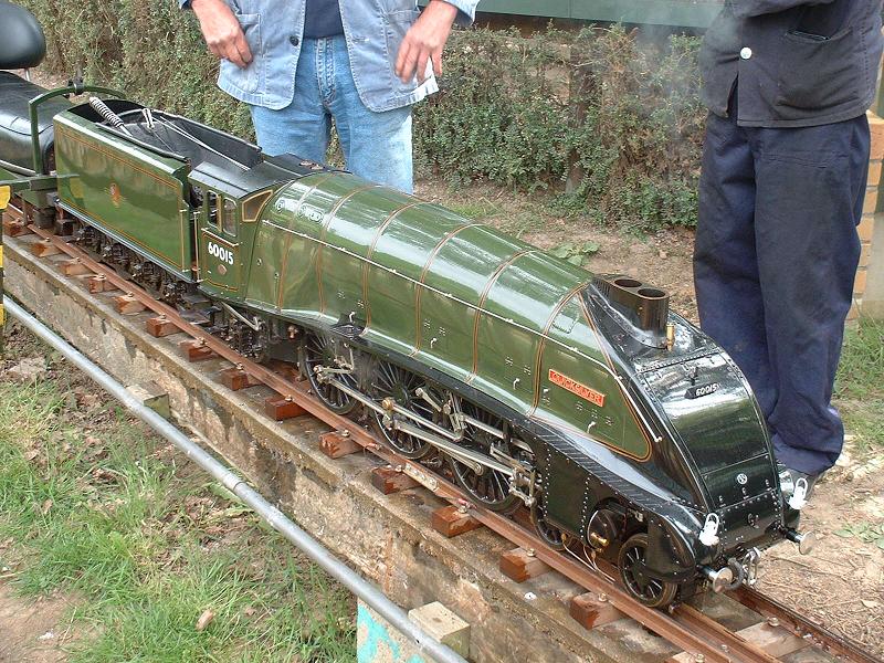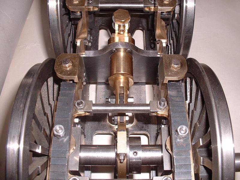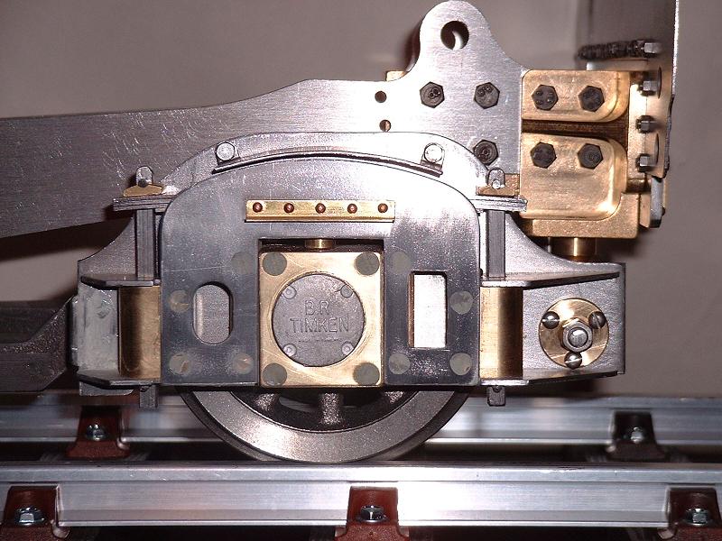 Yesterday I went to the LNER day at my North London club and saw among many fine models this superb 5" A4, along with a Winson 9F that was steaming nicely, both from the Colchester club. I've reduced the size of the gland packing nut on the axle pump so that it fits through the hole in the stretcher, but this still didn't enable me to refit the assembled pump - the leading axle gets in the way. I solved this by propping up the loco on wooden blocks and removing the stretcher downwards, then fitting the axle pump into it and refitting the stretcher to the frames. This was extremely fiddly, and involved removing the weighshaft brackets, so is not to be recommended. When I eventually dismantle the loco for painting, I'll probably cut away the bottom of the hole in the stretcher and make a larger pump spacer plate that I can bolt to the front of the stretcher to allow the pump to be removed downwards. I've also been thinking about ways of sorting out the inaccuracies in the motion gear, and I'll probably tackle this next.