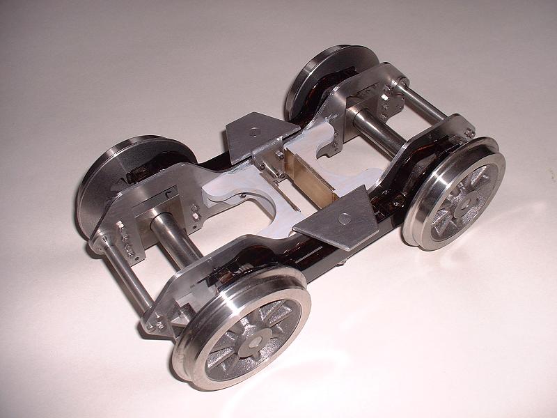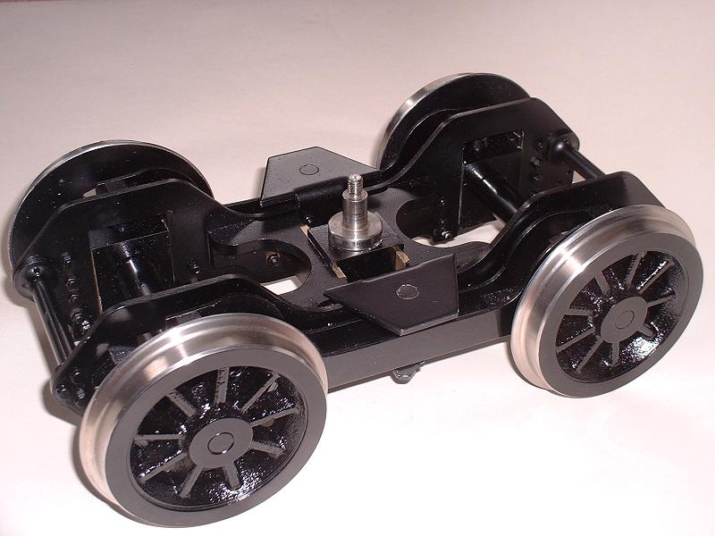 9/7/06 I've finally finished painting the bogie, as shown in this photograph. I found that the best way to get a clean edge to the paint on the front face of each wheel was to mask just the wheel tread and not the bevel, and carefully remove the paint from the bevel with fine wet-and-dry paper on a hard backing pad.