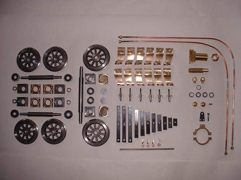 7/3/06 Kit 9 arrived this morning. It consists of the bogie and pony wheels, axles, axleboxes and bearings, the main springs, brackets and hangers, the axle pump and its pipework, and part of the cylinder cock operating linkage. I checked and photographed the parts, which all seem present and correct, except that the instructions mention a pump spacer fitted between the pump body and its stretcher which isn't listed in the inventory or included in the kit. I have checked with Debbie and the spacer is needed and is included in kit 10, but she's kindly offered to send me one out today. I have ordered some two-part etch primer and quick-drying thinners from Phoenix so that I can start on the airbrushing, along with their livery data sheet for the Britannia. I've been contacted by Harry W, who is currently building his tender.